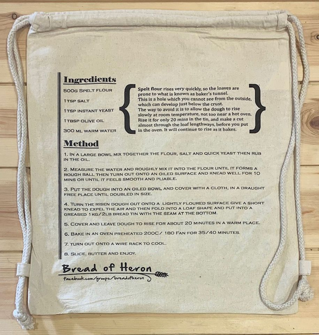 Our Spelt drawstring bag measures a whopping 36 x 40cm, is made of 100% cotton, and was manufactured in a certified fairtrade factory. The bag has a stunningly designed fact about Spelt wheat printed on the front, and a recipe for a basic spelt loaf printed on the reverse which you can try out in the comfort of your own kitchen using our spelt flour*!